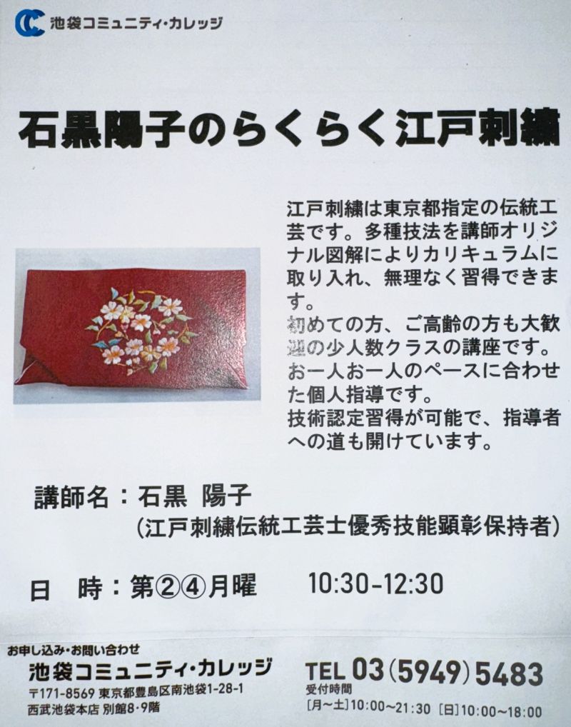 玉川高島屋「コミュニティクラブたまがわ」で東京都指定の伝統工芸”石黒陽子のらくらく江戸刺繍講座”を開催します。